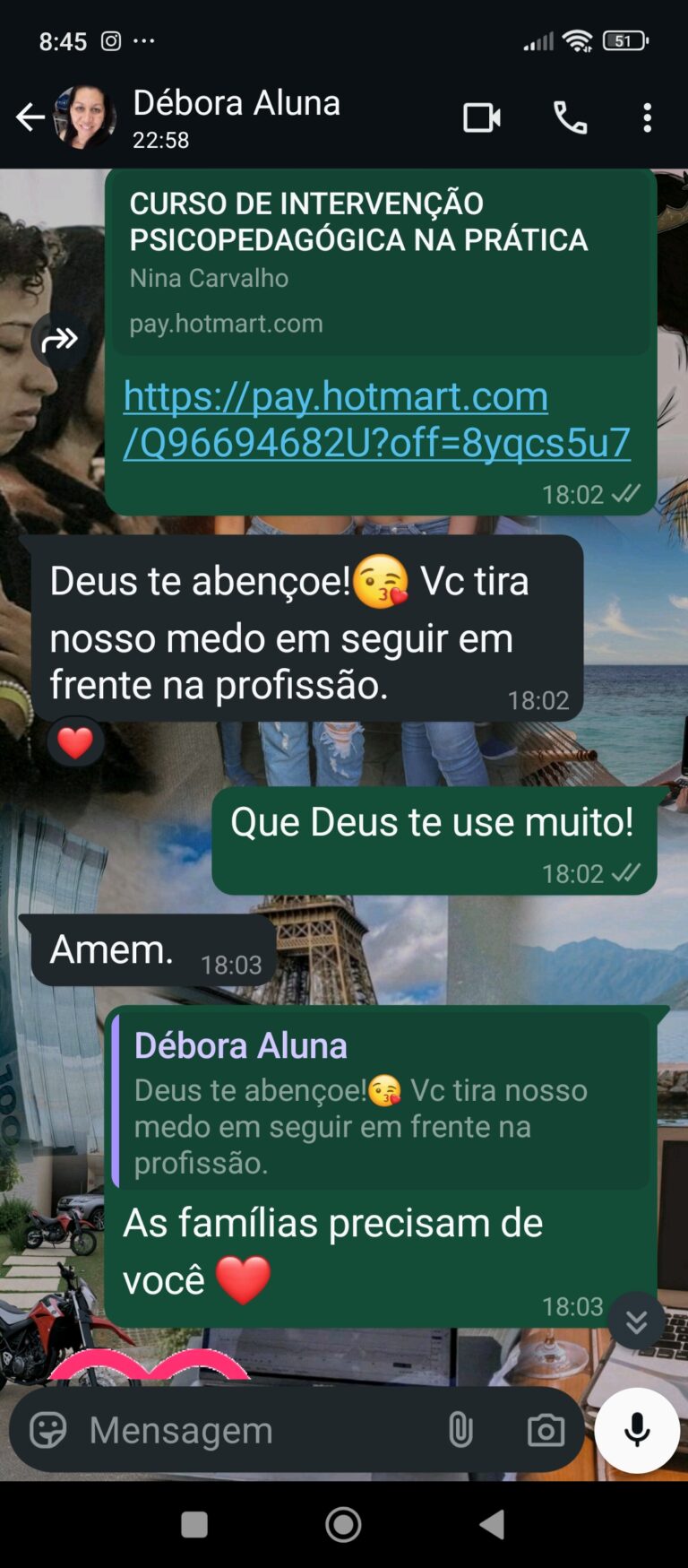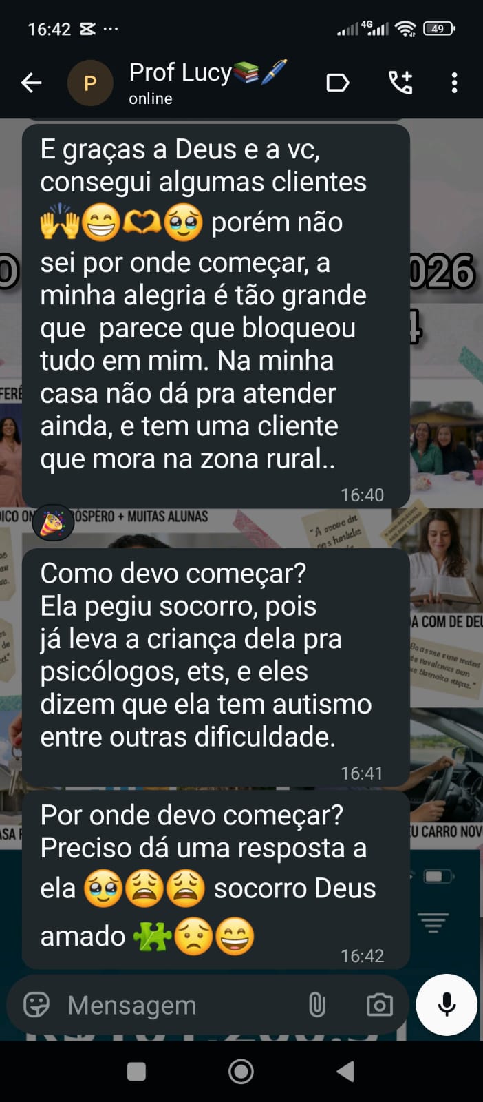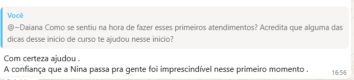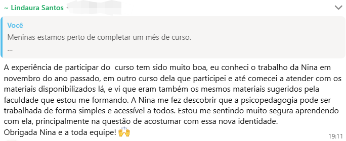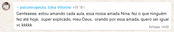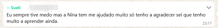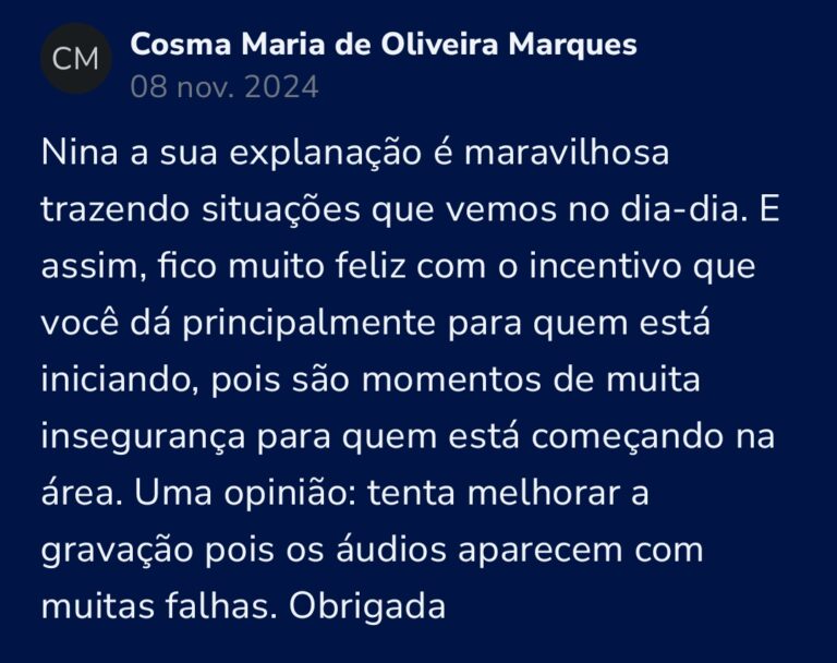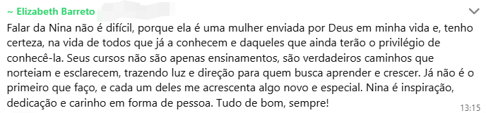 Rosinei superou a fase de insegurança em que cogitou até trabalhar de graça por não saber precificar seu conhecimento. Através das aulas da Nina, ela aprendeu a diferenciar “preço” de “valor”, estruturou um atendimento de excelência com visitas escolares e suporte às famílias, e hoje colhe o reconhecimento financeiro e os elogios de pais e professores pela evolução visível das crianças.