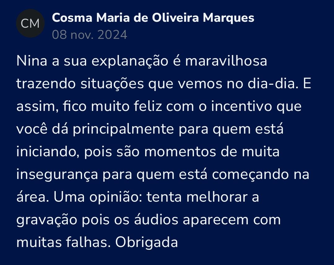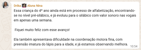 Lúcia, está em plena formação, antes ela sofria com a falta de clareza e com estudos sem rumo sobre alfabetização. Ao dominar a consciência fonológica através do método da Nina, ela conectou a teoria à prática, trocando a insegurança por uma base sólida e a confiança necessária para se tornar uma profissional preparada.