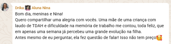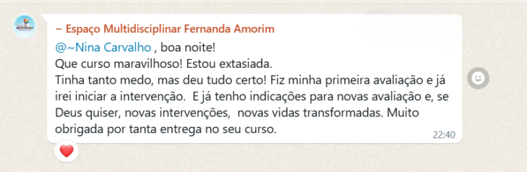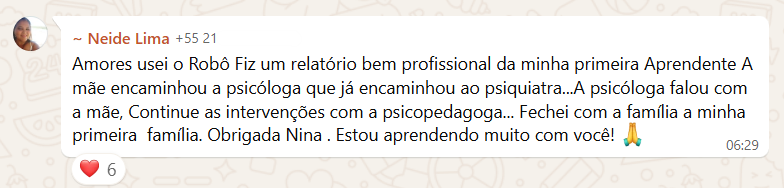Márcia superou o sentimento de “não saber nada” após a formação. Com o passo a passo da Nina, ela aprendeu a estruturar relatórios e anamneses, abriu sua própria clínica e hoje colhe resultados emocionantes, como a regulação de crises graves e a evolução real de seus aprendentes.