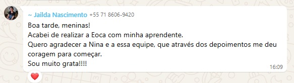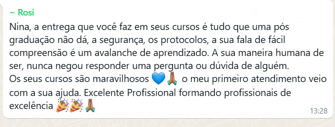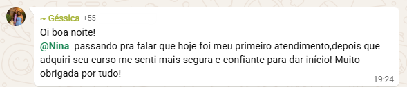 Jailda, formada há quatro anos, vivia paralisada pela insegurança de não saber como agir após a avaliação. Com o método prático da Nina, ela trocou o medo pela coragem: iniciou oficialmente seus atendimentos, e montou sua pasta de testes.
